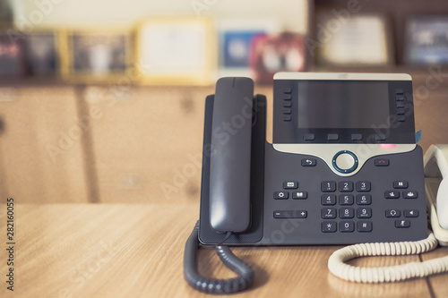 Fototapeta premium Close up soft focus on ip phone devices at office desk,Cocept business work.