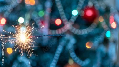 © sergofan2015, Obraz premium Close up sparkler on blurred Christmas tree background. Postcard.