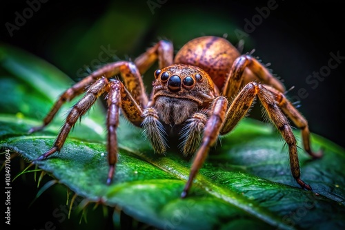 Fototapeta premium Close-up Spider on Leaf, Night Forest, Insects, Macro Photography