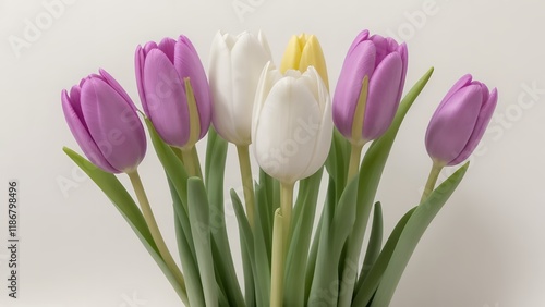 © Handz Boy, Fototapeta premium Close Up Spring Flowers Tulips Daffodils Hyacinths Textured Off White Background Natural Lighting Subtle Shadows High Resolution Microstock Ready