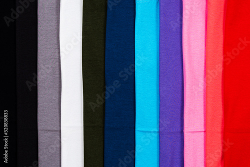 © Vatcharachai, Naklejka premium Close up Stack of Colorful cotton T shirt for bacground