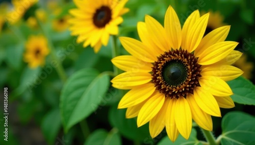 © haruki, Obraz premium Close-up sunflower, garden setting, lush leaves, visual, garden, vibrant