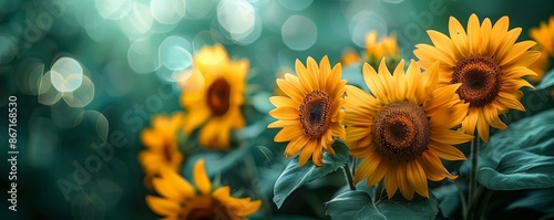 © Olga, Obraz premium Close up Sunflower on blurred green nature background. Horizontal agriculture summer banner with yellow sunflower. Summer greeting card, copy space.