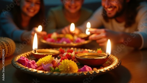 Fototapeta premium Close-up thali containing divine offerings adorned with flowers and religious symbols Smiling Middle Eastern family lighting candles for Diwali
