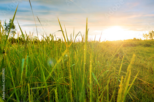 Fototapeta premium Close – up the sun ray and rice field. The rice field under the sun and...