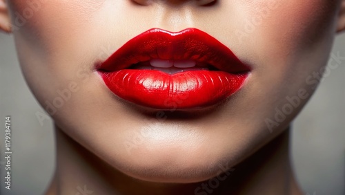 © prapatsorn, Fototapeta premium Close-up Tilt-Shift Photo of Red Lipstick on Lips, Miniature Effect
