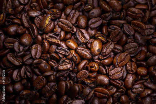 Fototapeta premium Close up to a heap of coffee beans. Macro photography of fresh roasted coffee...