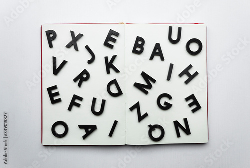 © Alejandro Bernal, Obraz premium Close up to lettering over blank notebook at white background. Reading and study concept photography