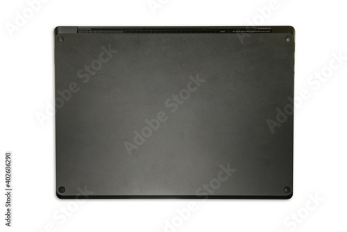 © Pawarun, Fototapeta premium Close-up top view of laptop in black color on white background