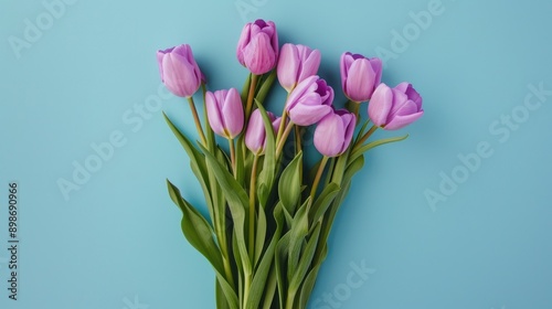 © AkuAku, Fototapeta premium Close up top view of violet tulips bouquet on blue backdrop