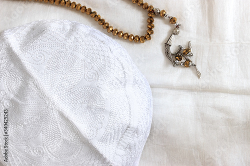 Fototapeta premium Close up top wiew of golden prayer beads and white skullcap on white prayer...