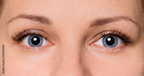 © DenisNata, Naklejka premium Close-up twarz pięknej młodej kobiety z pięknymi niebieskimi oczami i dużymi ładnymi rzęsami i brwiami. Makro oka ludzkiego - otwarte wyraziste spojrzenie.