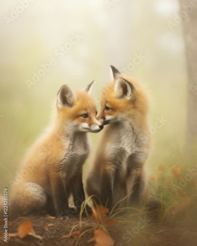 © Chiara Battaglia/imageBROKER, Naklejka premium Close-up, Two young red foxes playing in a misty forest landscape, AI generated