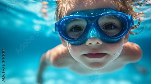 © Unic, Naklejka premium Close-up underwater shot of a young boy wearing blue swim goggles and swimming in a pool with clear blue water.