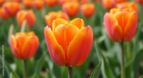 Fototapeta premium Close-up Vibrant Orange Tulips Blooming in a Lush Green Field during Springtime capturing the