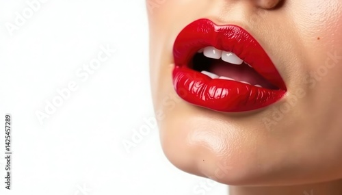 © ຈໍາປາ ຈໍາປາ, Obraz premium Close-up vibrant red lipstick, pristine white backdrop, lip balm, lips, lip