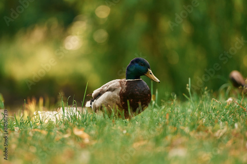 Fototapeta premium Close up view. Mallard duck standing on green grass in a serene park setting