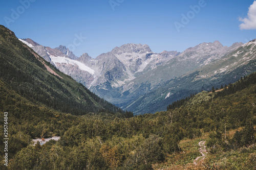 Fototapeta premium Close up view mountains and river scenes in national park Dombay, Caucasus