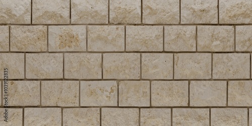 © Höyka Studio, Obraz premium Close up view of a beige stone brick wall. The bricks are rectangular and arranged in a horizontal pattern, with visible mortar lines between them. Interior design concept. Abstract background