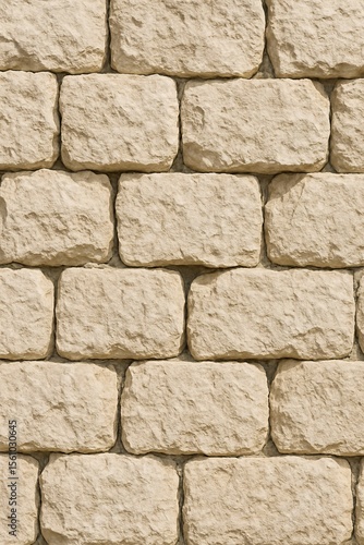 © Imagine , Fototapeta premium Close-up view of a beige stone wall with rough textured blocks arranged in a uniform pattern, ideal for architectural backgrounds, construction details, and rustic surface design concepts