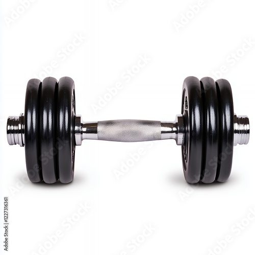 © Ronnakrit, Naklejka premium Close-up view of a black dumbbell with chrome handles, isolated on a white background, ideal for fitness and weight training image