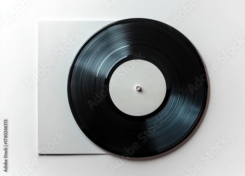 © btiger, Obraz premium Close-up view of a black vinyl record with grooves placed on top of a plain white square sleeve against a white background