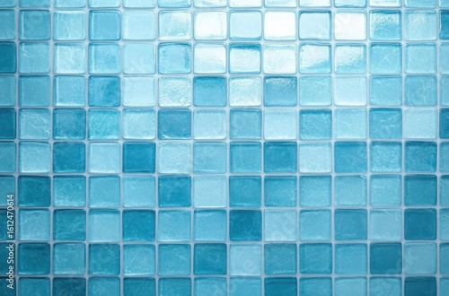 © Aleksandra, Fototapeta premium Close-up view of a blue mosaic tile wall with varying shades creating a calm and refreshing pattern