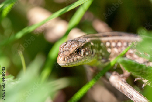 © Ekaterina, Obraz premium Close up view of a brown lizard on the ground. A small lizard looking at camera