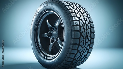 Obraz premium Close-up view of a car tire showcasing intricate tread pattern with detailed grooves on a blue gradient background.