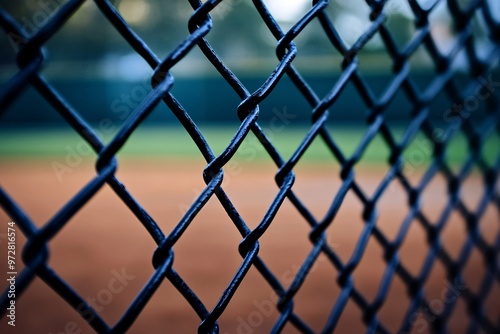 © Stanley, Fototapeta premium Close-up view of a chain link fence surrounding a baseball field during a sunny afternoon