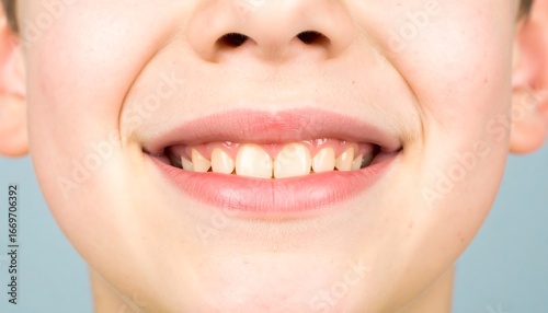 Obraz premium Close-up view of a child's smiling mouth and healthy teeth against a soft...