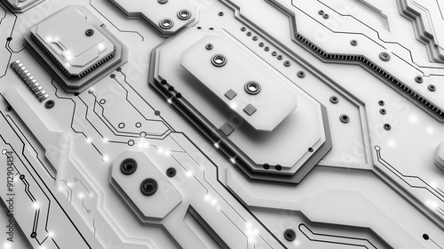 © Akuma, Fototapeta premium Close-Up View of a Circuit Board with Electronic Components in Monochrome