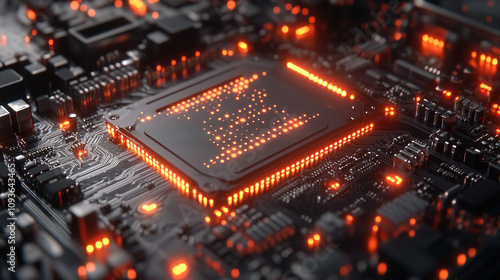 Obraz premium Close-up view of a circuit board with glowing orange lights showcasing...