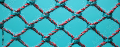 © Oatkhaphon, Fototapeta premium Close-up view of a colorful rope net against a turquoise background, showcasing texture and woven patterns.
