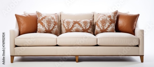 Obraz premium Close-up view of a cozy couch adorned with soft pillows against a plain white background