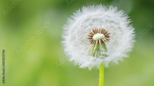 Fototapeta premium Close-up view of a dandelion seed head, showcasing its delicate white seeds and brown center against a soft green background. : Generative AI
