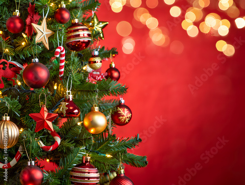 Fototapeta premium Close up view of a decorated christmas tree with festive red and gold ornaments against a bokeh light background