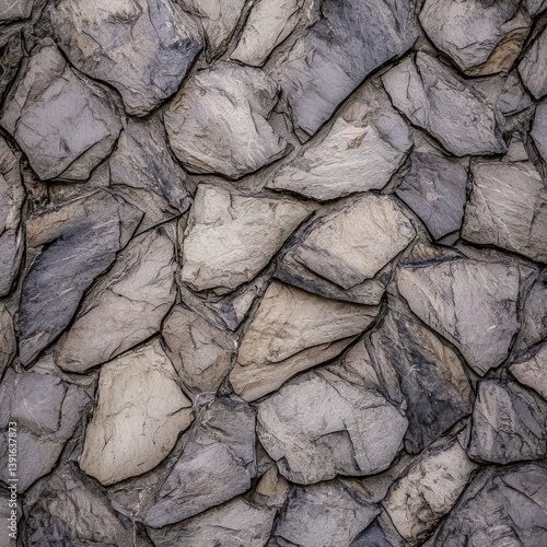 © harukazeburm, Fototapeta premium Close-Up View of a Decorative Wall Made of Irregular Grey and Beige Chipped Stones Highlighting the Rough Texture and Unique Natural Patterns