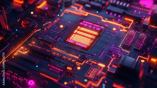 Fototapeta premium Close-up view of a detailed circuit board with glowing lines.