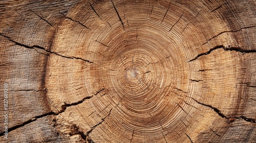 © Ilia K, Naklejka premium Close-up view of a detailed tree stump showing growth rings and natural patterns