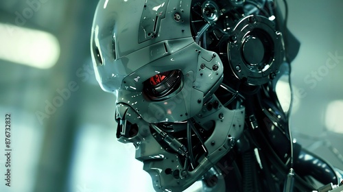 © Mas, Fototapeta premium Close-up view of a futuristic robot face with glowing eyes.