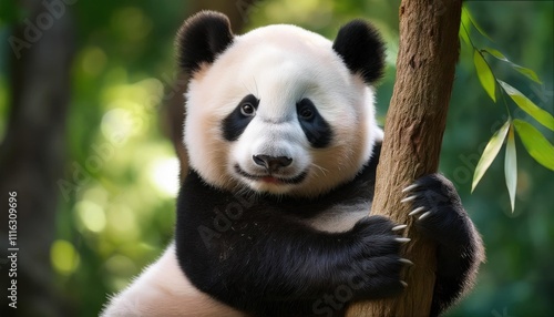 Obraz premium Close-up view of a giant panda hugging a tree with a curious and playful...