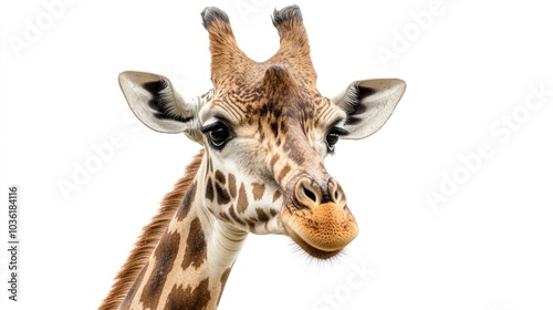Fototapeta premium Close up view of a giraffe s head isolated on a white background