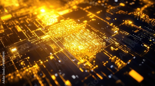 Fototapeta premium Close-up view of a glowing circuit board with intricate designs, showcasing...