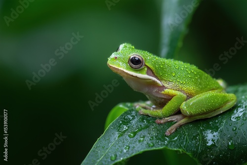 © nik_yurginson, Naklejka premium Close up view of a green frog resting on a wet leaf in a lush environment during a humid morning