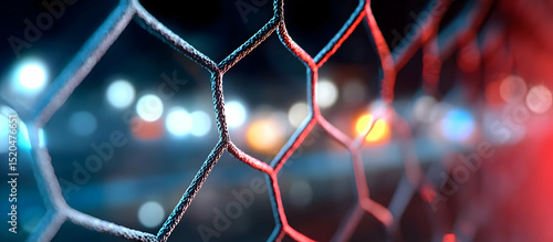 © sornram, Fototapeta premium Close-up view of a hexagonal wire mesh with blurred lights in the background, showcasing modern materials and aesthetics.