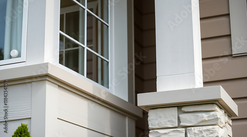 © MatandSterre, Fototapeta premium Close-up view of a house exterior, showcasing a corner with a multi-paned window, off-white siding, and a stone-faced column. The color palette is neutral, with shades of beige and off-white.