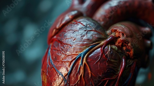© Fotograf, Naklejka premium Close-up view of a human heart with flowing blood. This image can be used to illustrate medical concepts or in educational materials related to the cardiovascular system