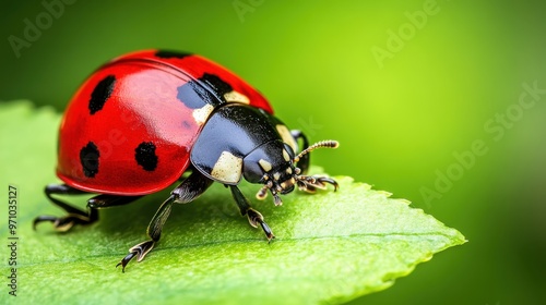 Fototapeta premium Close-up view of a ladybug on a leaf with vibrant red and black colors against a green background showcasing the delicate details of the insect in a natural setting