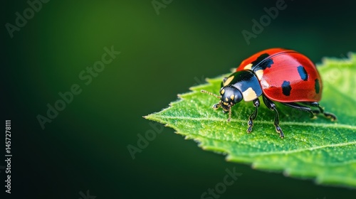 © shobakhul, Naklejka premium Close-up view of a ladybug on a vibrant green leaf.